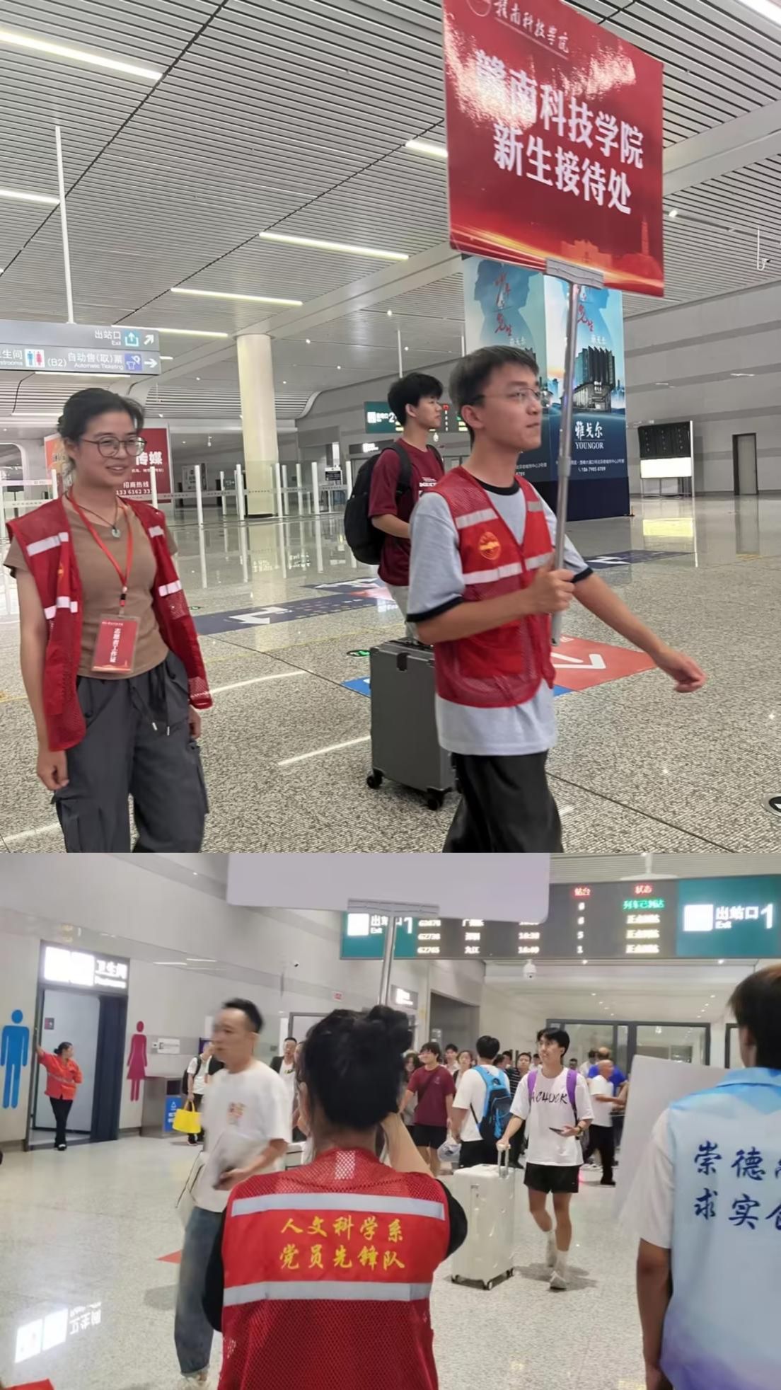 清晨,十大体育网站本科生第一、第二党支部的迎新志愿者们便身着统一的“红马甲”,手持醒目的引导牌,早早地守候在赣州西站、黄金机场的出站口。员工党员们坚守岗位,团结协作,在新生出站时上前接待并帮忙搬运行李,引导新生到公司接待处并分批次乘坐车辆到校报到。他们面带微笑,全天守候,轮流值班,以饱满的热情迎接每一位新生及家长的到来,充分展现了党员的良好风貌。