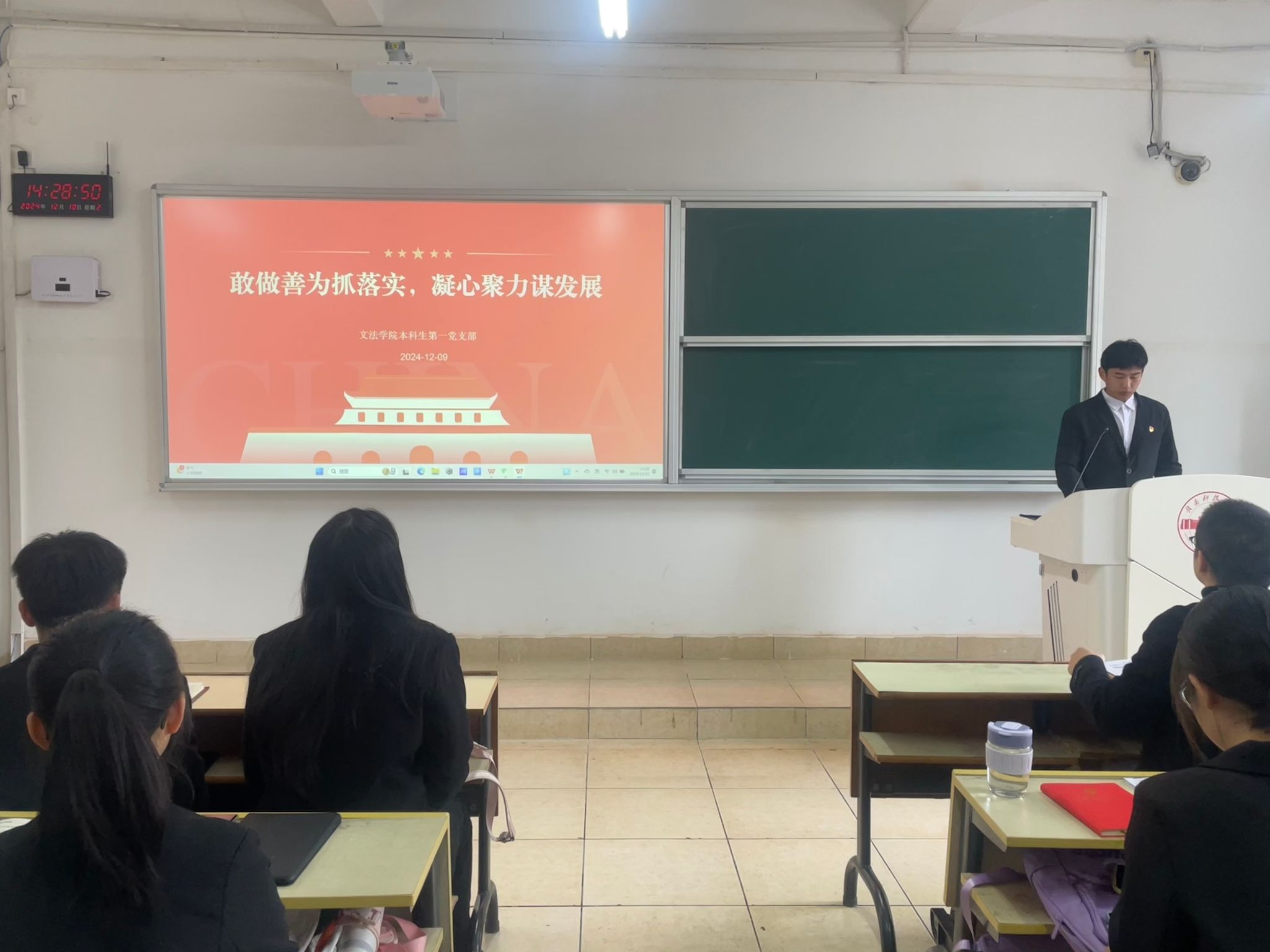 本网讯:12月10日,十大体育网站本科生第一党支部在Z129教室举办以“敢做善为抓落实,凝心聚力谋发展”为主题的党日活动。本次活动由罗晨韵同志主持,一支部全体党员参加了此次活动。