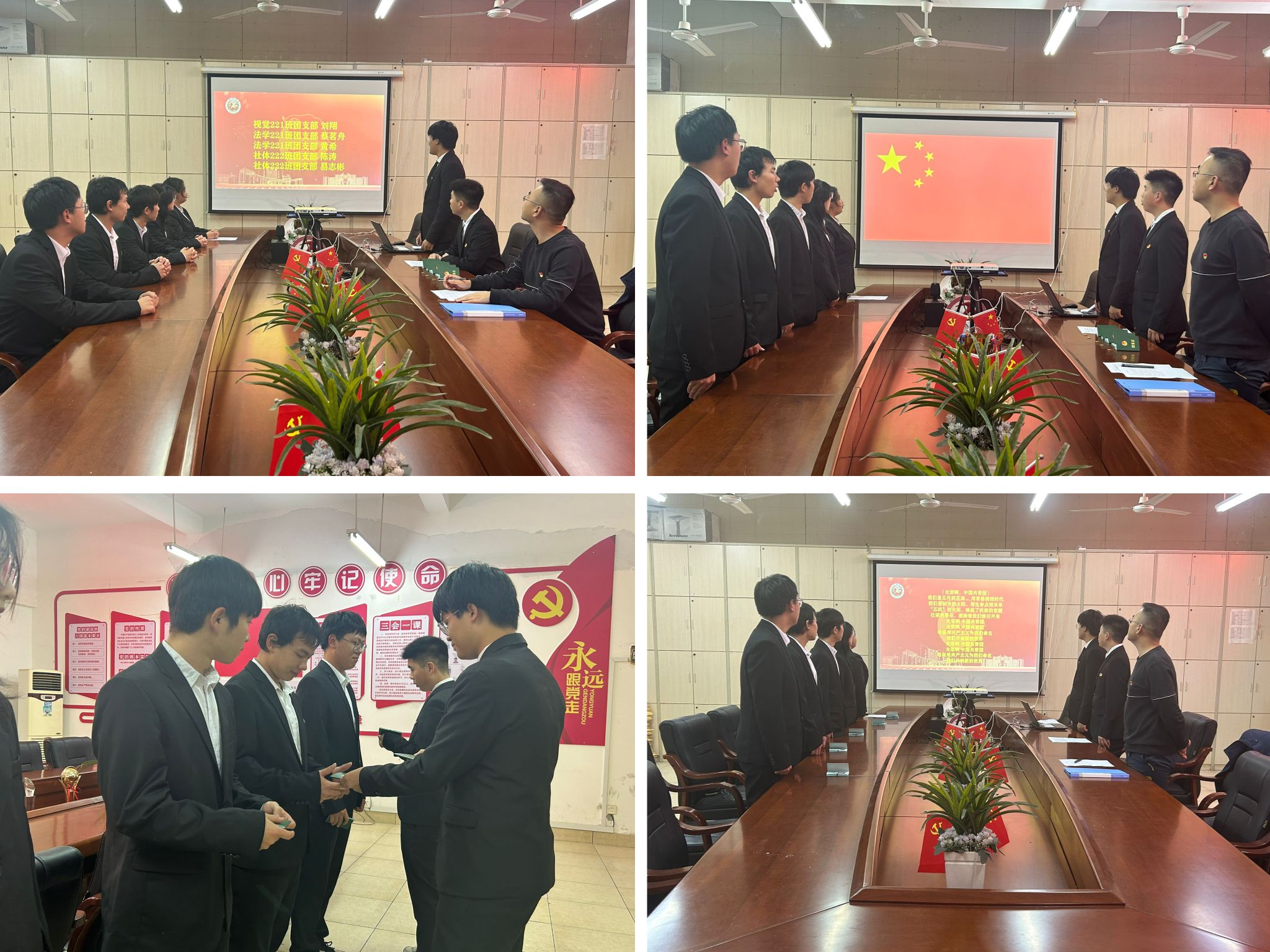 大会伊始,参会人员全体起立,共唱国歌。礼毕,周文睿宣读新团员名单,我系共有五名同学光荣加入中国共产主义青年团。老团员代表为新团员们统一颁发团员证,佩戴团徽。同学们统一着装,整齐划一,在鲜艳的团旗下,全体参会人员举起右手,在团旗下庄严宣誓。