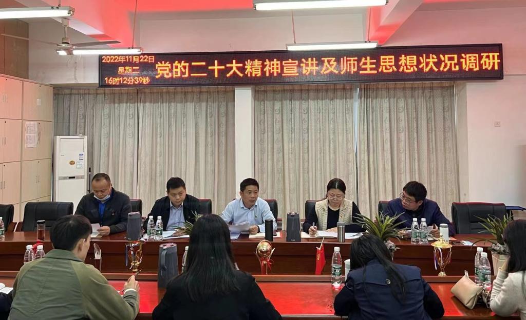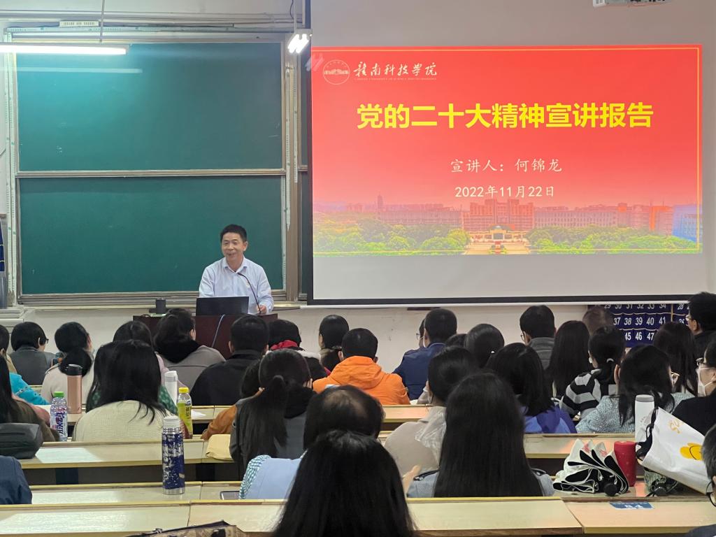2022年11月22日下午,人文科学系举行党的二十大精神宣讲报告及2022年度师生思想状况调研会,校过渡期委员会常务副主任、应科公司党委副书记、经理何锦龙参加并作党的二十大精神宣讲报告。会议由人文科学系党总支李国鹏主持。