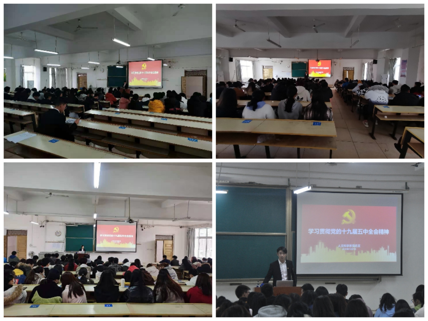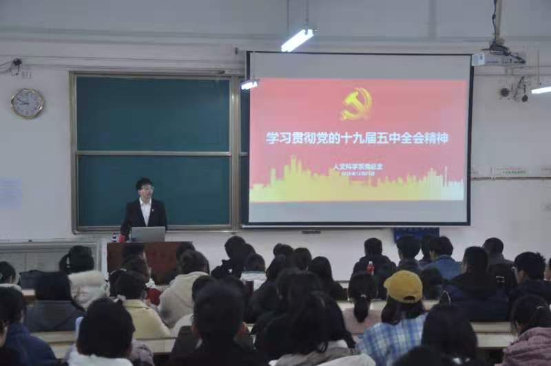 为了深入学习十九届五中全会精神,2020年12月01日下午14点人文科学系党总支组织2019、2020级全体员工学习党的十九届五中全会精神。人文科学系党总支书记李国鹏同志、人文科学系本科生支部牛英萍同志以及人文科学系团总支书记郭豪同志参加本次宣讲会。