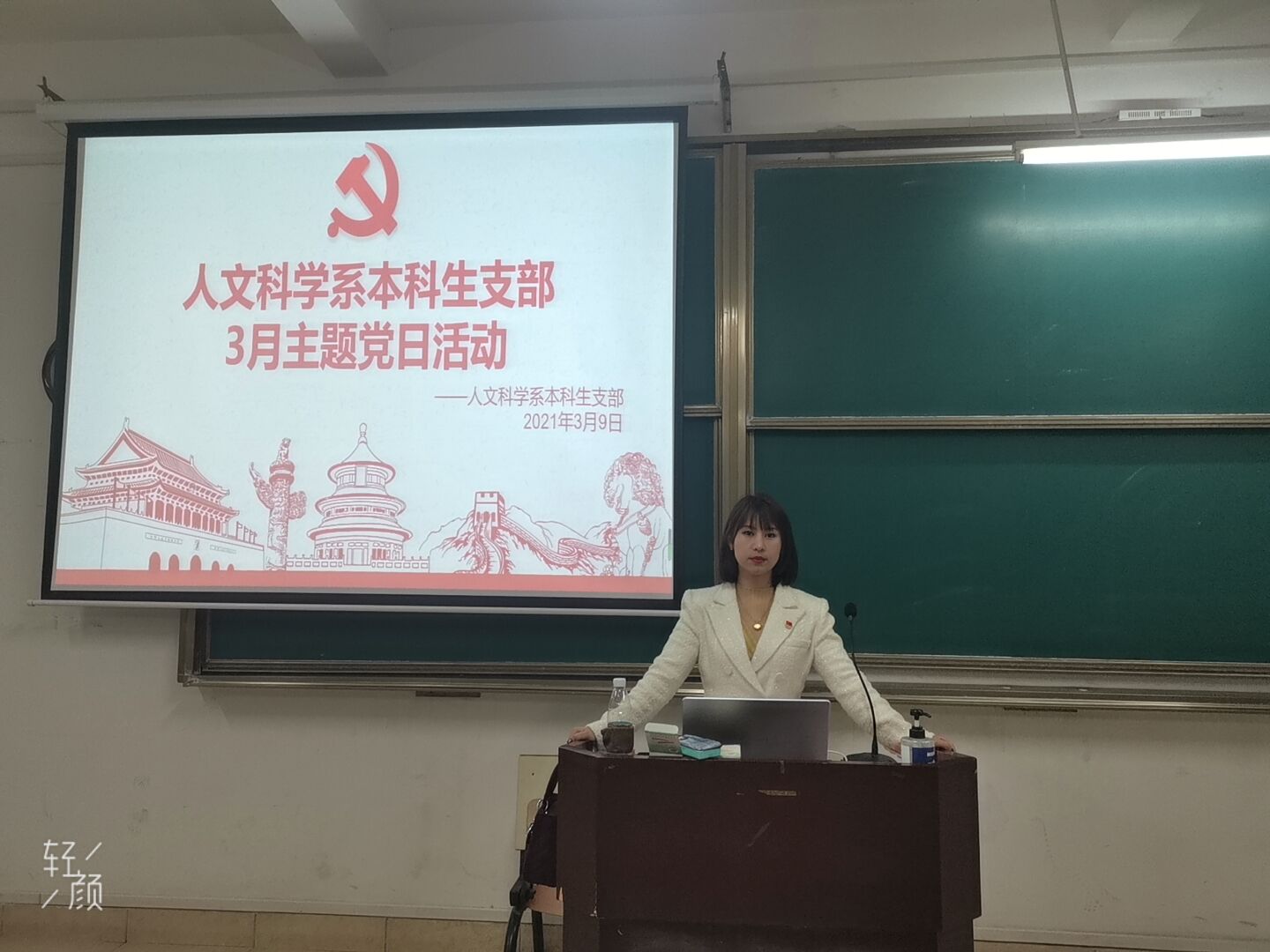 为深入学习习近平总书记重要讲话精神,贯彻党史精神,2021年3月9日晚7点,人文科学系本科生党支部结合我系“一支部一品”项目,顺利开展了3月主题党日活动。本次主题党日活动由本科生党支部书记牛英萍主持。