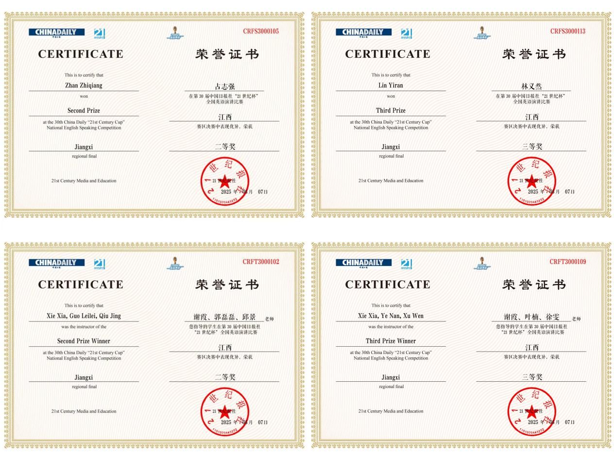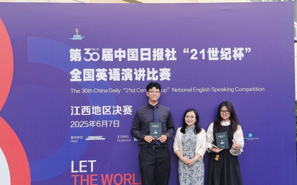 本网讯:6月7日,第30届中国日报社“21世纪杯”全国英语演讲比赛江西赛区复赛在南昌大学顺利举行,公司英语231占志强,法学232班林义然分获江西赛区二等奖、三等奖。