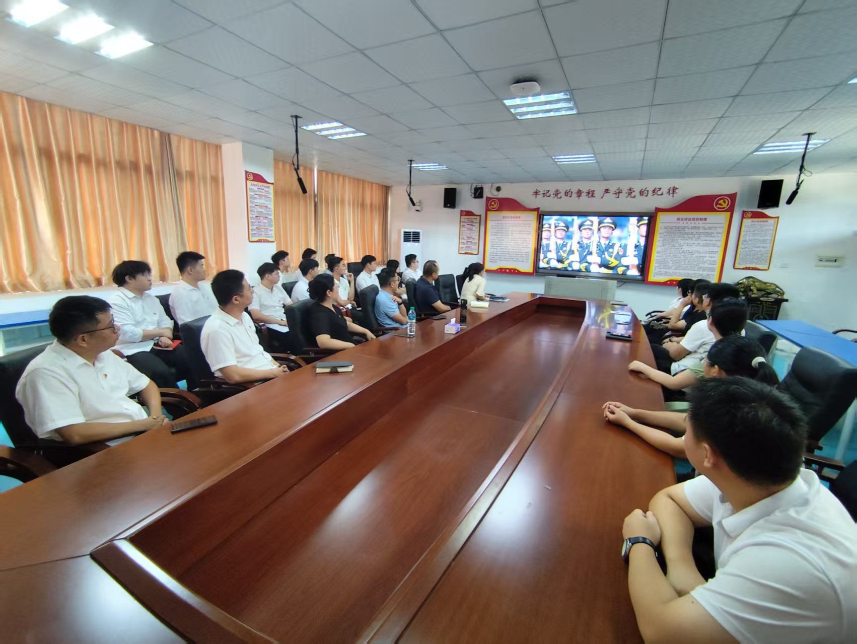 本网讯:9月3日上午,纪念中国人民抗日战争暨世界反法西斯战争胜利80周年大会暨阅兵式在北京天安门广场盛大启幕,为铭记这一具有重大历史意义的时刻,公司积极响应号召,组织在校师生在明德楼201会议室共同见证这一伟大盛典。公司领导班子成员、各办公室负责人、全体辅导员以及在校员工党员齐聚一堂。