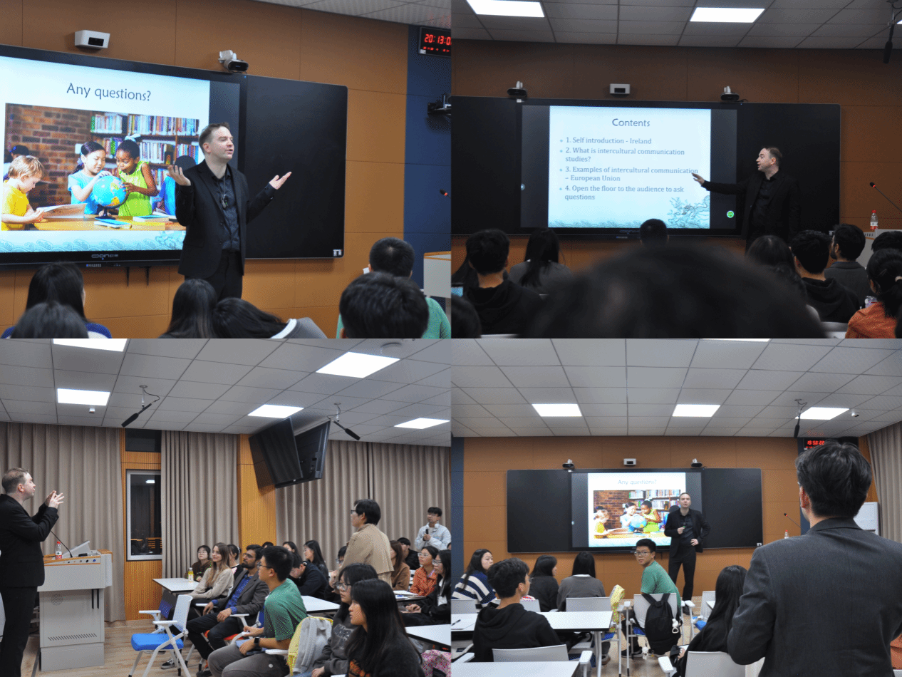 唐纳教授凭借其多年的跨文化教学及研究经验,对爱尔兰的风土人情进行了全面且有趣的阐述,使得在场的员工们对爱尔兰产生了浓厚的兴趣。随后,唐纳教授以欧盟为例,从四个方面进行了讲解,深入剖析了跨文化交流的概念、重要性、障碍以及应对措施。他以清晰且深入的讲解方式,揭示了跨文化交际的总体结构,并逐步进行分解。在互动环节中,唐纳教授与现场的师生就爱尔兰的文化习俗以及如何开展跨文化交际等问题进行了热烈的讨论。通过互动,同学们更加深入地了解了爱尔兰的文化特色以及跨文化交际的方法和技巧。
