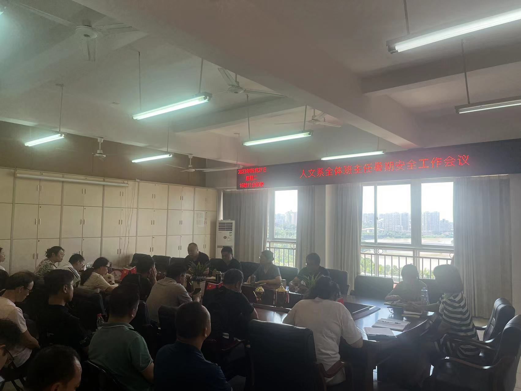 本网讯:6月27日下午,我系召开全体班主任暑期安全工作会议。人文科学系主任高健婕,党总支书记李国鹏、副主任何建军、主任助理王军堂、全体班主任及辅导员参加了此次会议。会议由王军堂主持。