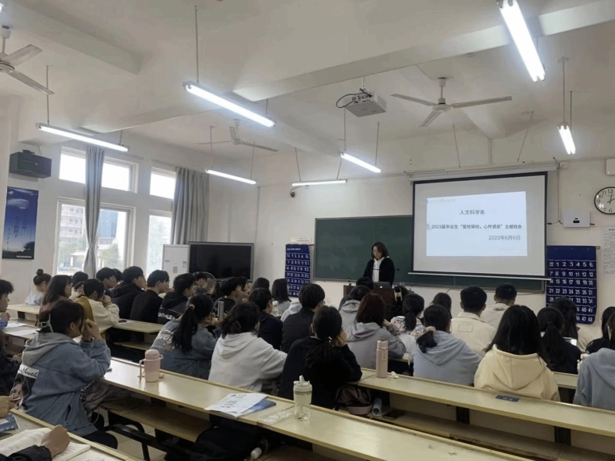 2023年6月6日,人文科学系在主教Z1D3举行了一场以“爱校荣校,心怀感恩”为主题教育活动。本次活动旨在激发毕业生对母校的热爱和荣誉感,增强他们的归属感和责任感。本次会议参加人员主要有辅导员牛英萍以及23届优秀毕业生代表。
