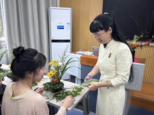 谢东琳以东西方插花文化的差异性导入本次课程的主题,通过各国插花文化的历史变迁和相互借鉴比较,激发同学们的民族自豪感。在宋代花艺体验过程中,谢老师让同学们共同协作引导大家探索“宋韵插花”的魅力。同学们通过课程不仅了解了宋代插花的人文精神,学习了宋代插花的技艺,体会了“插花是立体绘画”的含义,同时,还对宋代“平淡天真、高洁清雅”的审美价值与精神追求有了深刻认识。