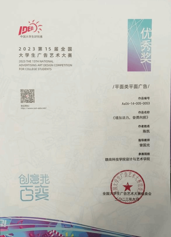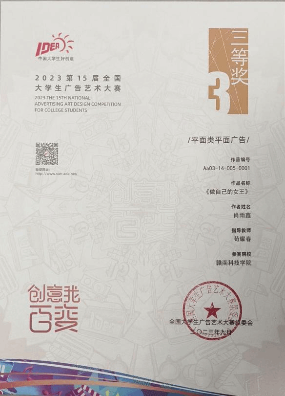 2023年第十五届全国老员工广告艺术大赛比赛成绩揭晓,在公布的获奖名单中,视觉传达设计专业师生成绩斐然、硕果累累。在选送的30件作品中公司共计获得12个奖项,其中肖雨鑫同学的作品获得全国三等奖,王雨惠同学作品获得江西省一等奖,其它获奖作品分获二等奖3项,三等奖6项。