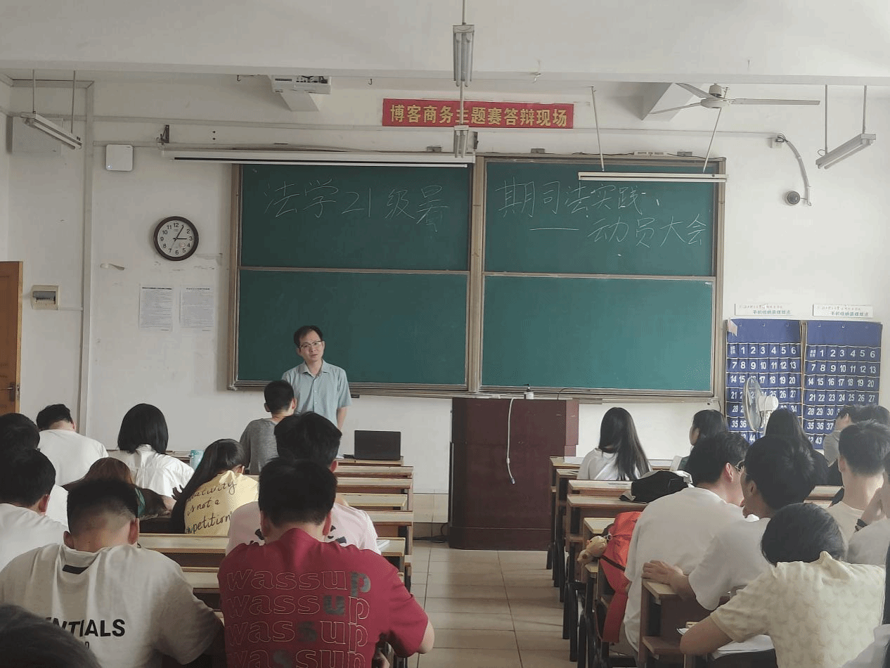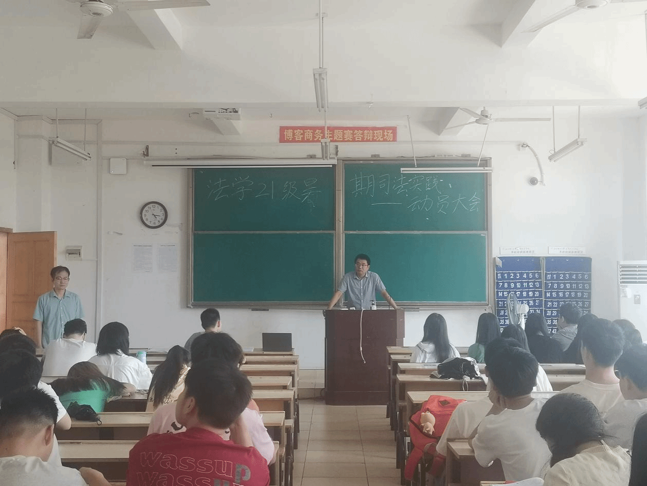 为进一步提高法学专业员工实践能力,引导员工将法学理论与实践相结合,保证暑期司法实践工作顺利开展,2021级法学专业暑期司法实践动员大会于6月26日下午在主教学楼Z202教室召开,人文科学系副主任何建军、法学教研室主任刘翛然、法学21级班主任欧阳东和21级法学专业全体员工参加了此次动员大会。
