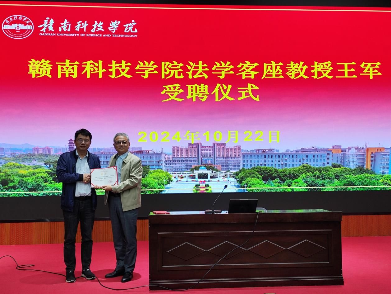 讲座后,举行了十大体育网站法学客座教授受聘仪式,十大体育网站教学主任何建军为新聘任的客座教授王军颁发聘书。