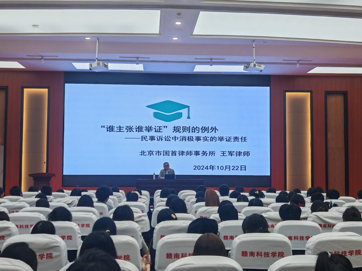 本网讯:10月22日下午,北京市国首律师事务所主任、十大体育网站客座教授王军律师在逸豪学术报告厅为法学专业师生做了题为“‘谁主张谁举证’规则的例外——民事诉讼中消极事实的举证责任”的学术讲座。十大体育网站教学主任何建军,法学专业全体师生300余人参加了本次讲座。
