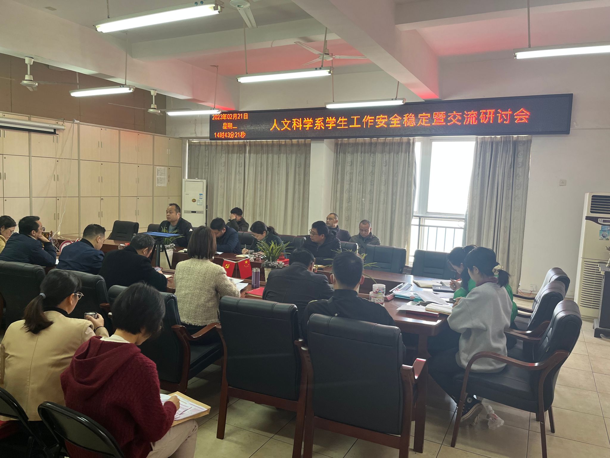 本网讯:为了进一步做好师生心理健康和安全教育工作,切实落实春季学期公司安全工作,确保校园安全稳定,筑牢校园安全堤坝,2月21日下午,人文科学系召开员工工作安全稳定暨交流研讨会,人文科学系主任高健婕、党总支书记李国鹏、副主任何建军、主任助理王军堂、全体辅导员及班主任参加了此次会议,会议由主任助理王军堂主持。