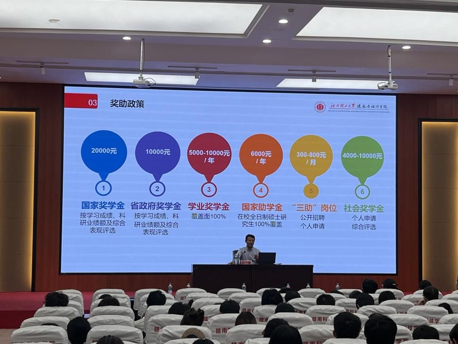 随后,刘现鹏围绕“设计学类考研方向与政策解读”展开主题宣讲。他首先从团队建设角度出发,系统介绍了江西理工大学建筑与设计公司的发展历程、硕士点建设情况、团队力量及科研平台;结合2025年研究生招生最新动态,详细解读了报考条件、初试科目、复试流程、调剂政策及奖助体系等内容。他鼓励有志于设计研究的优秀学子积极报考,同时,他还分享了往年招录情况、优秀毕业生发展案例,帮助同学们更直观地了解考研路径与成长空间。