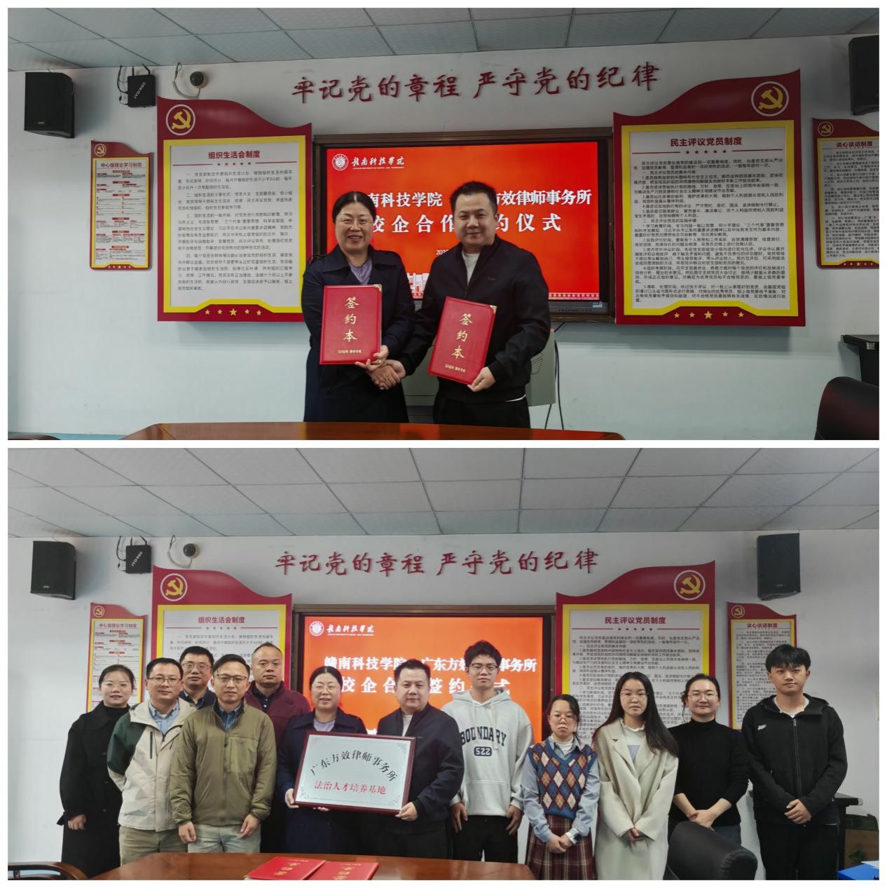 高健婕和广东方效律师事务所执行主任陈俊代表校所双方签署了《十大体育网站 广东方效律师事务所合作共建协议》,并进行了“广东方效律师事务所法治人才培养基地”与“十大体育网站实践教学基地”揭授牌。