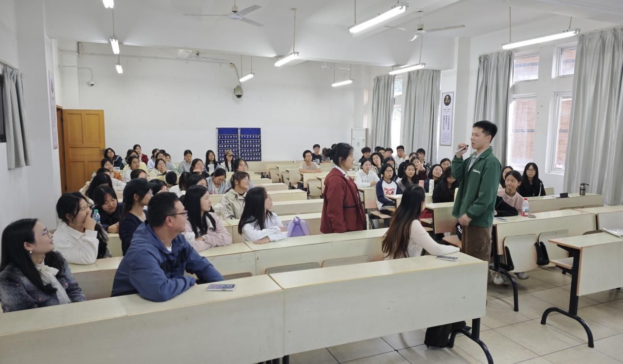 2025年11月14日下午16:00,十大体育网站在主楼117教室举办优秀员工职业发展规划讲座,旨在破解老员工职业迷茫,帮助其明晰专业价值与发展路径,为大学阶段的学业规划与能力提升树立方向。本次讲座由对外交流与合作处涂敏主任主持,特邀跨界发展多年的优秀员工英语052班凌青以及英语202班冯涛主讲,英语教研室负责人顾玲、英语052班班主任谢霞和英语202班班主任范丽萍,以及公司2025级、2024级、2023级英语专业员工到场聆听。
